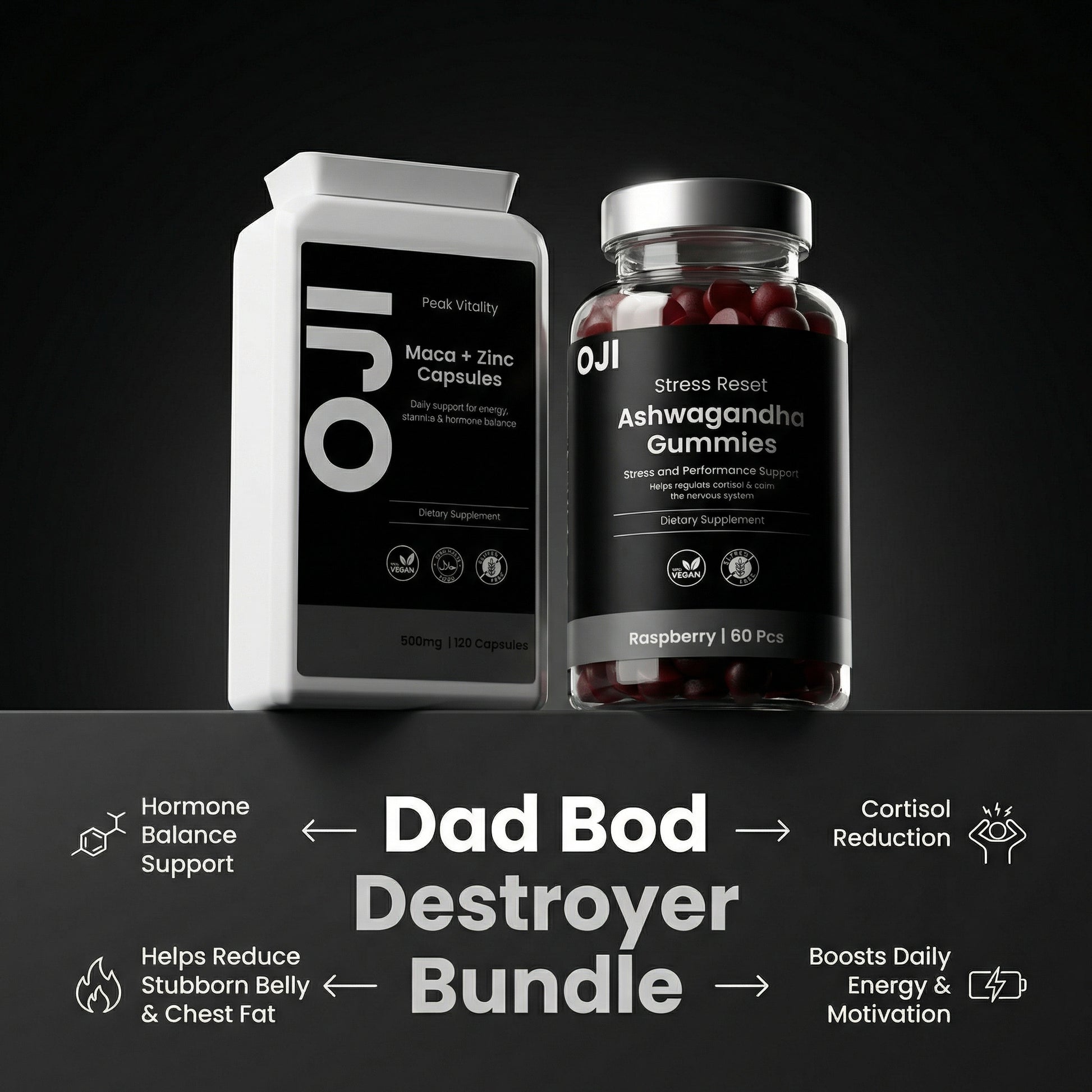 The Dad Bod Destroyer Bundle is a simple, daily hormone-support system designed for men dealing with: